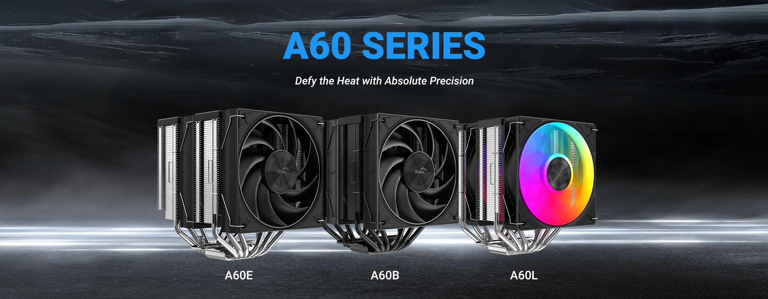 Introducing the SAMA A40: a sleek all-black cooler with a brushed metal top, direct-touch heatpipes, and a 120mm guide ring fan for efficient, quiet cooling in a compact design.
